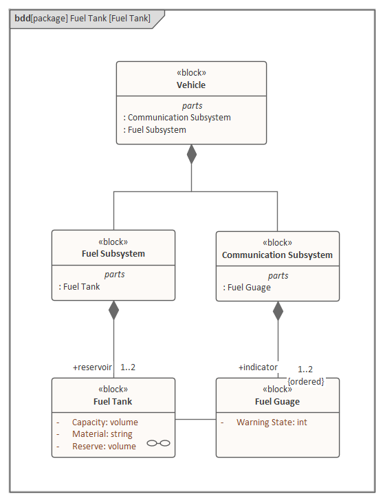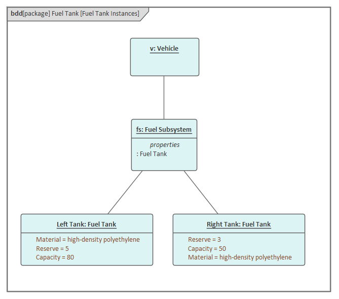 In the Fuel Tank diagram the car is modeled as a classifier (Block) level, where the model is describing a generic vehicle and representing the fact that a vehicle could have one, or a maximum of two, fuel tanks. This Fuel Tank Instances diagram, however, describes a particular vehicle that has two fuel tanks that have different capacities and reserve volumes.