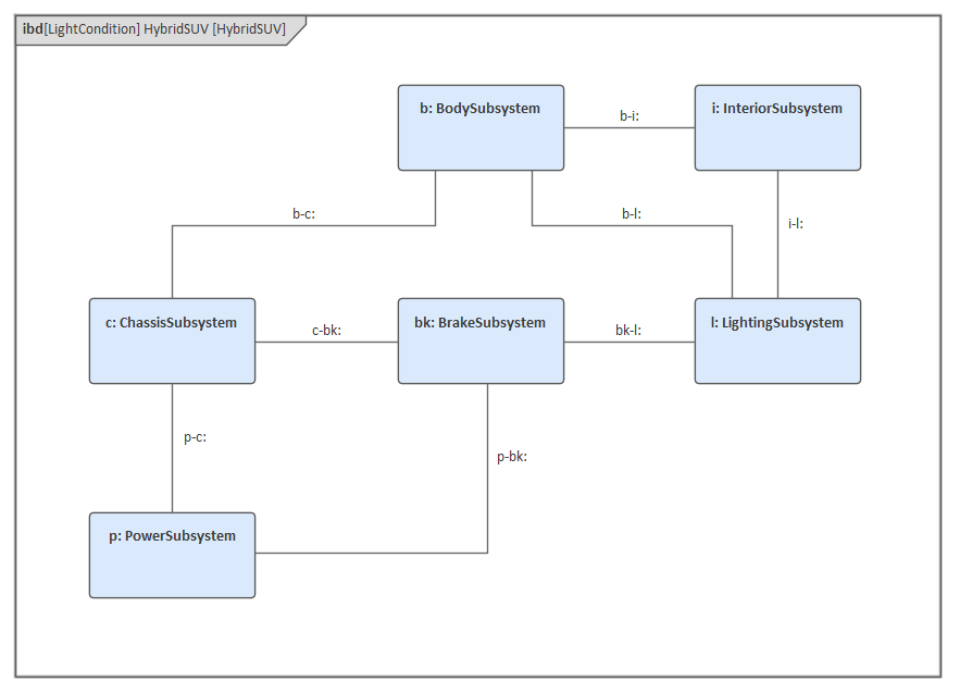 Some relationships have been suppressed in the diagram; for example, the Power Subsystem would typically have a connection to the Lighting Subsystem. This point is important, as newcomers to SysML and Enterprise Architect often think that every defined relationship should be displayed in a diagram. While this statement appears to be true it is important to remember that a modeler, like a cartoonist creating a caricature, will often leave details out of illustrations to focus the viewer's attention on other subjectively more important elements and connectors.