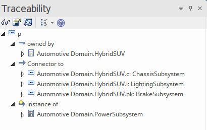Regardless of which connectors are displayed in a diagram, a modeler can always view all of an element's connectors by selecting the element in the diagram and viewing the Traceability window. In this screen capture the Power Subsystem has been selected, and even though the connector between the Power Subsystem and the Lighting Subsystem has been set to 'not Visible' in the diagram, the relationship can be seen in the Traceability window.