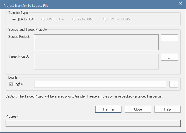 Note that in the 'Transfer Type' panel the 'QEA to FEAP' radio button defaults to selected. In the 'Source Project' field, browse for and select the name of the source QEA project. |