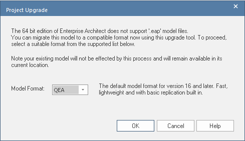 With the introduction of 64 bit Enterprise Architect, we are migrating away from legacy EAP file repositories to the new default format of QEA or QEAX file repositories (as well as an option to use FEAP). This is primarily due to the lack of 64 bit support in the EAP architecture.