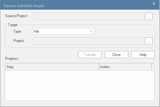 In the 'Source Project' field, click on the Browse. button and browse for and select the name of the source EAP or EAPX file to transfer.