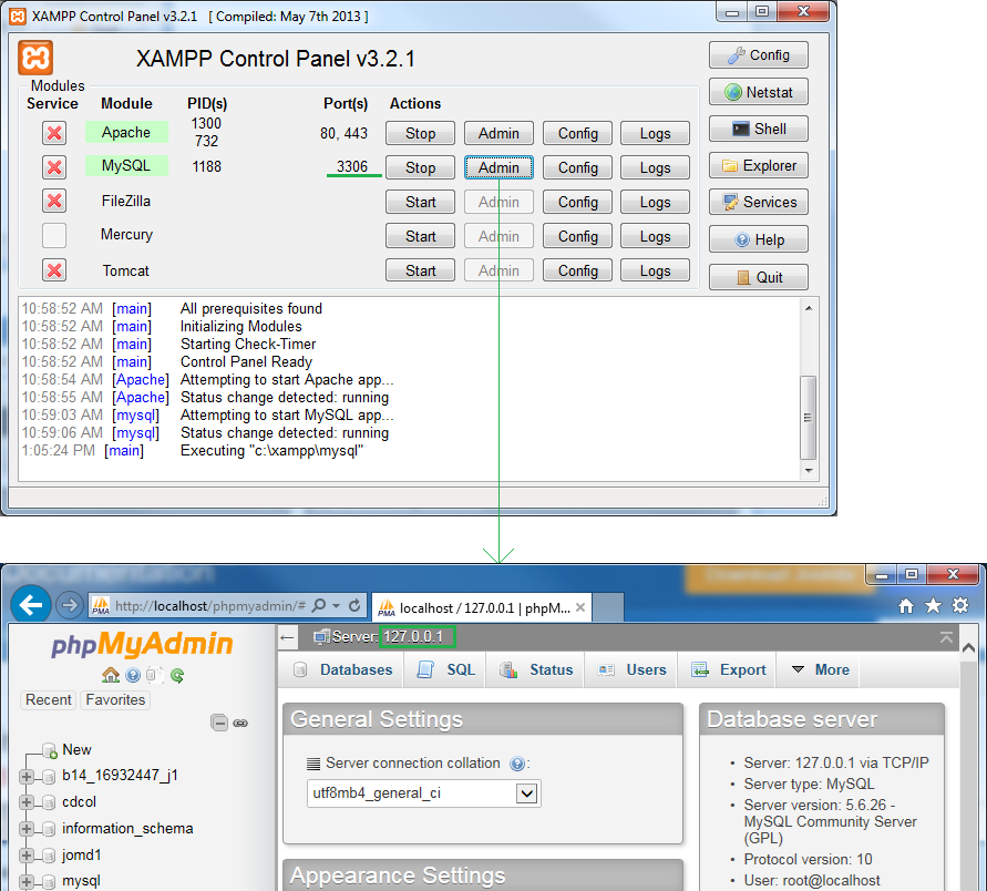 • The host address of the DBMS server - – if you have installed MySQL DBMS using XAMPP, then the host address and Port can be determined as boxed and underlined, respectively, in green on these control panels: