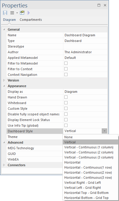 Open the diagram containing Chart elements that you want to lay out, click on the diagram background, then use the ribbon or keyboard method to open the Properties window for the diagram. In the 'Appearance' section, in the 'Dashboard Style' field, click on the drop-down arrow and select the style to apply.