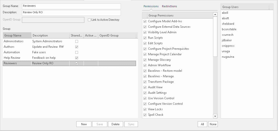 Enabled if the group is linked to a Windows Active Directory. Click on this button to synchronize the group with the Active Directory (that is, import specific users into the model from the Active Directory). You use this option when you initially set up the User Group; subsequent user IDs must be added to the user group manually.