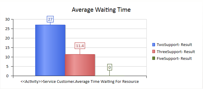 We started with two support resources, then tried three and five resources. After simulation, we have a BPSim Report based on different configurations: TwoSupport-Result, ThreeSupport-Result and FiveSupport-Result.