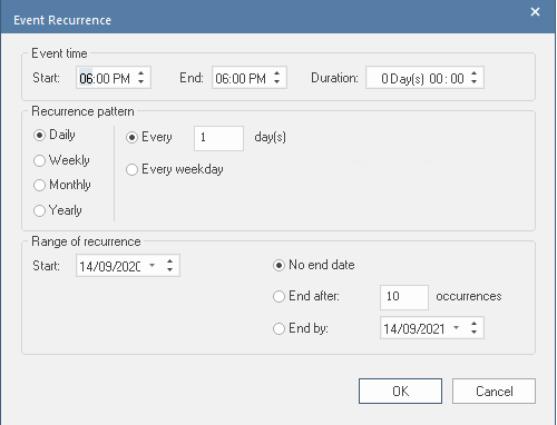 You can add a new calendar, or edit or delete a selected calendar. - To add a new calendar period, click on the to display the 'Event Recurrence' dialog.