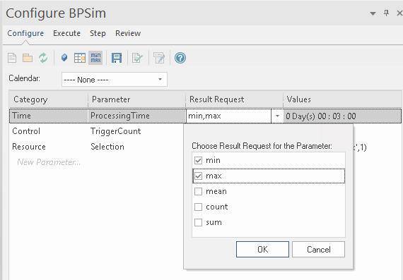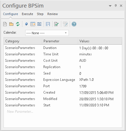Note that once you have added all possible parameters for a scenario, the Configure BPSim window does not allow you to attempt to add more.