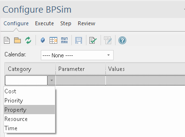 Choose 'Property' as a category, then click on the drop-down arrow in the 'Parameter' field and select a property.