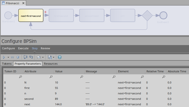 If you keep clicking on the , the properties in the list will change their values. The illustration shows that on entering task 'next = first + second', the value of property 'next' changes from 89 to 144.