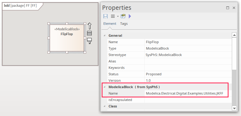 Place the copied text inside the Properties window for the SysPhS Modelica Block, in the 'Name' field under ModelicaBlock ( from SysPhS ):.