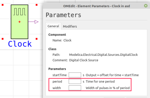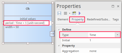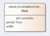 The Clock and Boolean-true Blocks both have properties defined in their respective components in MATLAB and Modelica. Let's use the Clock as an example. For this component-type, in both Simulink and Modelica, we need to set a value for the period of each pulse and the width of each pulse. These Properties must be set and typed. The value of the Properties will be set in the IBD, the Parametric diagram or possibly in the simulation Datasets. To set the property defining the period: