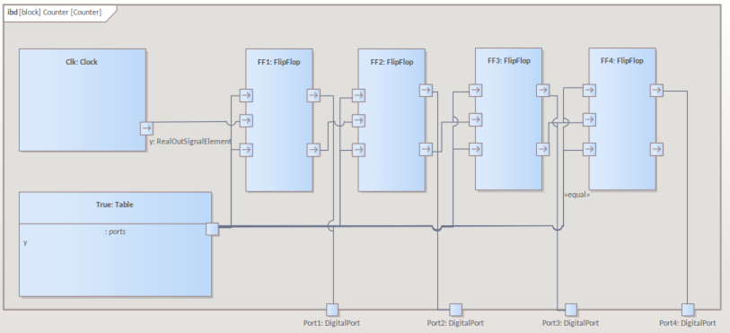 In SysML, using SysPhS, the circuit and each of the component-types can be represented using a Block. Firstly create a Block Definition diagram (BDD) under a Package called 'Digital Model'. In the BDD, you will create a set of components for the circuit, as SysML Blocks. The circuit contains representations of four Part-types - a pulsed digital signal source, a Flip-Flop, a boolean Port and a logical boolean true state. These Parts are of different types, with different behaviors. Create a SysPhS Block for each of the Part types. The Parts for the circuit Internal Block Definition (IBD), will be connected through Ports, which represent electrical pins. These must be defined in the BDD. This figure shows the BDD, with Blocks defining the types of component used. ![]() Note that these Blocks are created from the SysPhS Toolbox using either Modelica Blocks or Simulink Blocks. You can type these Blocks to both tools. For more information see the Setting Blocks as Both Modelica and Simulink Help topic. |