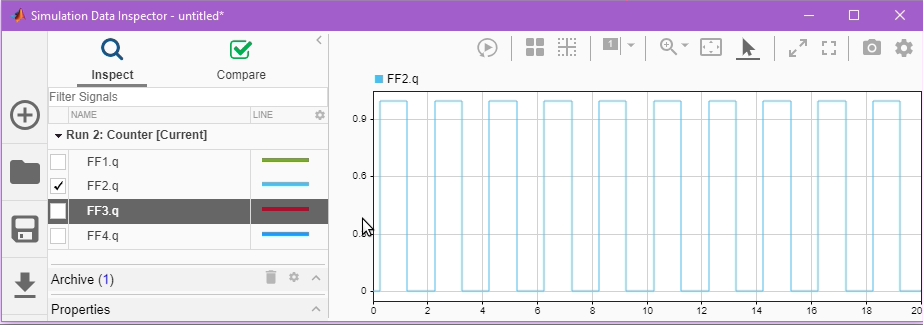 The circuit in this example includes a pulsed digital signal source, four Flip-Flops and a logical Boolean true state to form a simple frequency divider circuit.