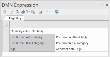 In this example, the decision 'Eligibility' returns a string 'ELIGIBLE' and invokes BusinessKnowledgeModel 'Eligibility rules' by binding the parameters as shown: