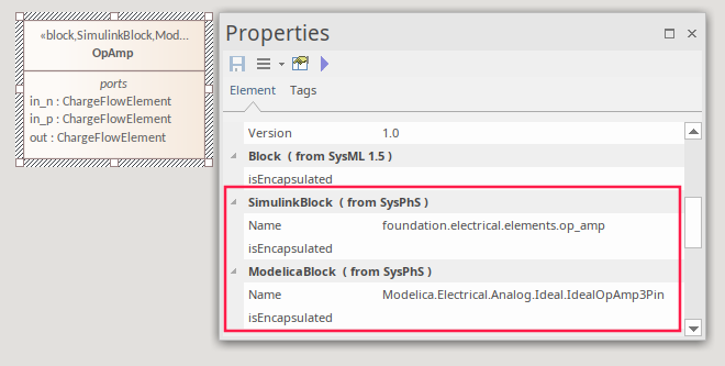 To set the properties manually for both products, you must set the Stereotype for both. To do this on a newly-created SysPhs Block element, in the Properties window for that element: