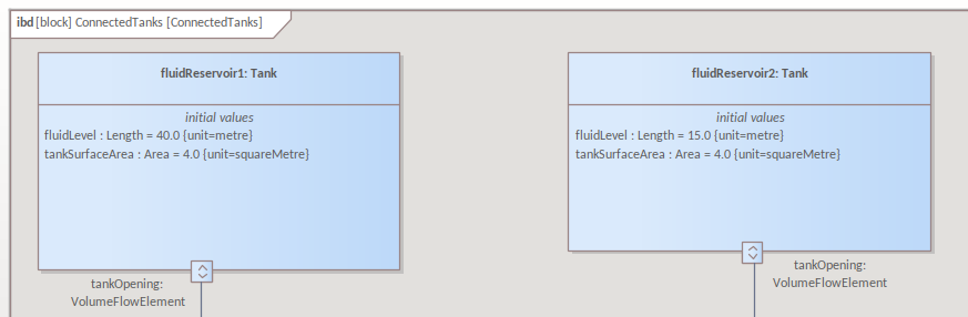 In this example we have two tanks with same radius, but different depths, so the fluidLevel (depth of the tank), is different for the two Tank parts created in this IBD.