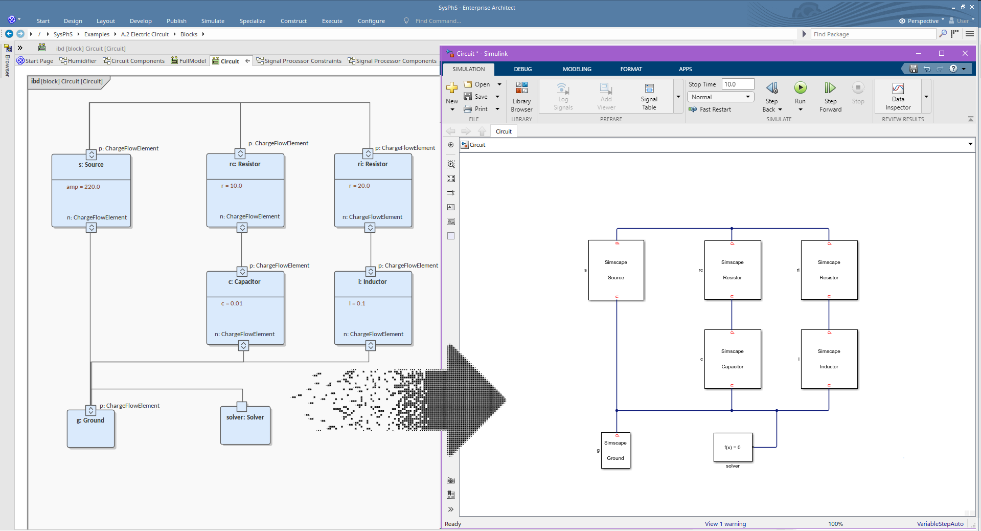 Enterprise Architect can translate SysML Internal Block diagrams into MATLAB's Simscape, which is an optional extension to Simulink that allows modeling of physical systems and instructs MATLAB to simulate and plot the requested outputs. The Blocks represent physical objects, and the flows represent the physical flow of a substance or energy (such as liquid, current, gas, flux, force/torque, heat flow and so on; for example, water flowing from one tank to the next, or current flowing through a resistor). You can use the built-in SysPhS patterns to access the vast array of pre-built Simscape library blocks, or create references to your own custom library Blocks using the SimulinkBlock stereotype.