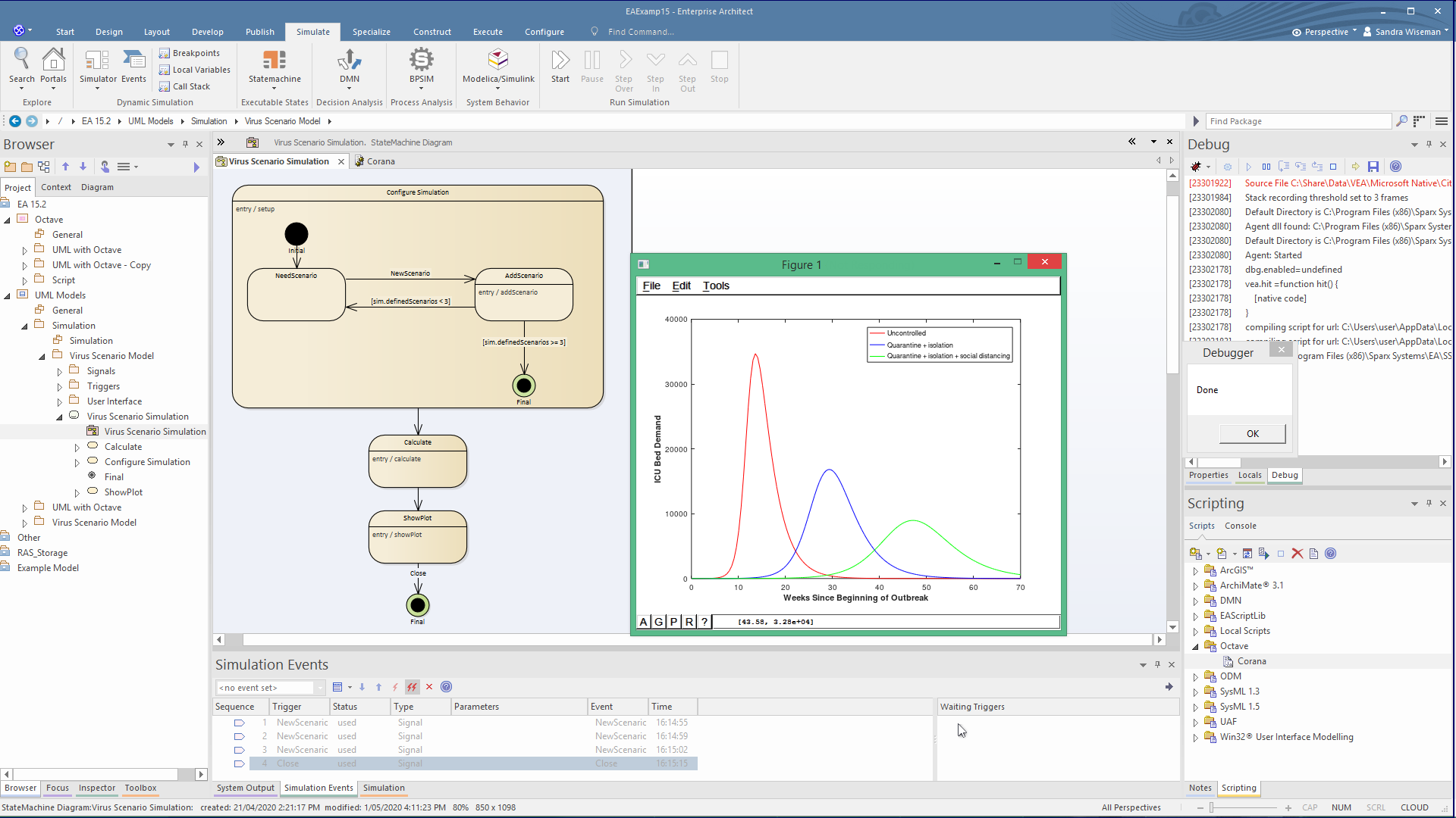 From Enterprise Architect Release 15.2 onwards you can use JavaScript to invoke 'Solvers' that provide integration with external tools such as MATLAB and Octave. The Solver Class provides a real-time connectivity to your external mathematical tool, through which you call complex and high order mathematical functions during the execution of Simulations within Enterprise Architect.
