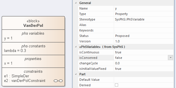 - Notice also that, in the Properties window, you can see the Stereotype defining the type of the property, and the options for that property type (as Tagged Values) as defined in the SysPhS standard.