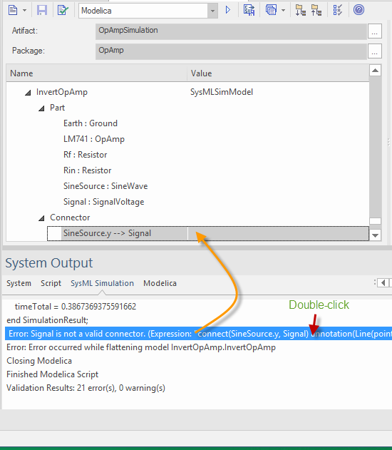 - For any error listed in the System Output window, if it is related to a specific element, double-clicking on that error will locate the associated object in the left pane of the Configure Simulation window