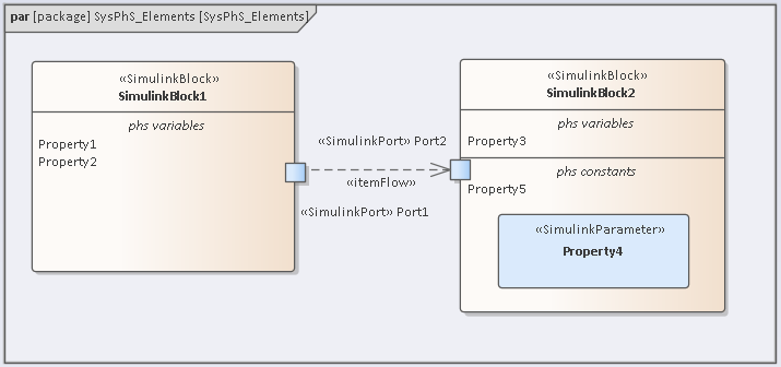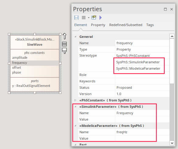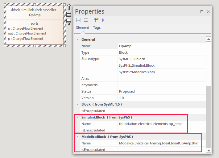 Note: As shown in the image, the two SysPhS Stereotypes can both be applied if you want to simulate the model in both external tools. See the Setting Blocks as Both Modelica and Simulink Help topic.