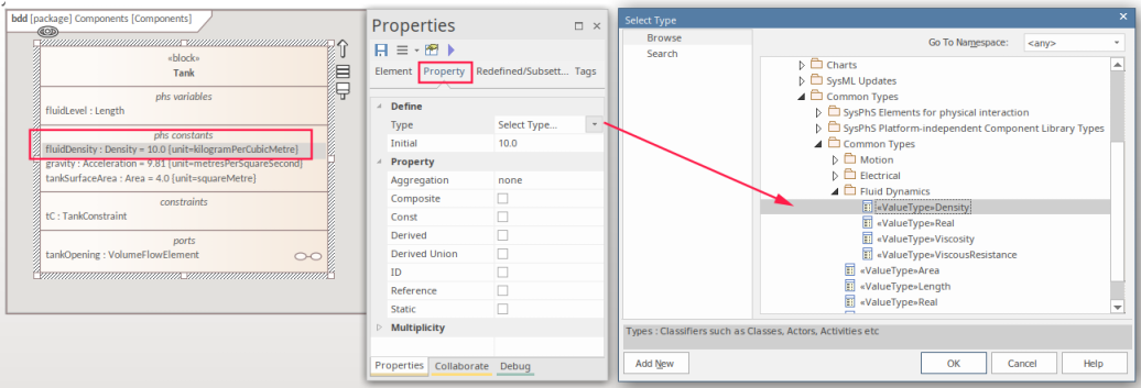 The type can be set as a standard type or, as in this case, as SysML ValueType referenced in the model.