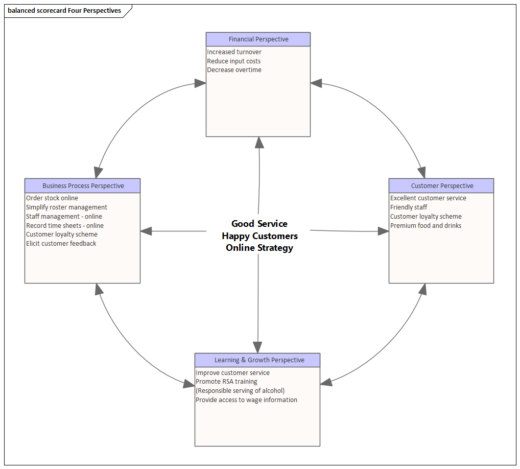 The diagram you have created using this procedure illustrates how the company vision and strategy is directly tied to each of the four perspectives. Resource allocation is based on results and strategy rather than a set of arbitrary financial numbers from the previous financial year. The Balanced Scorecard approach helps to ensure that business activity is engineered to adhere to company values and meet targets. Enterprise Architect allows each perspective to be linked to supporting documentation, model information and rigorous benchmarks that verify whether strategic initiatives have been undertaken and associated targets met.