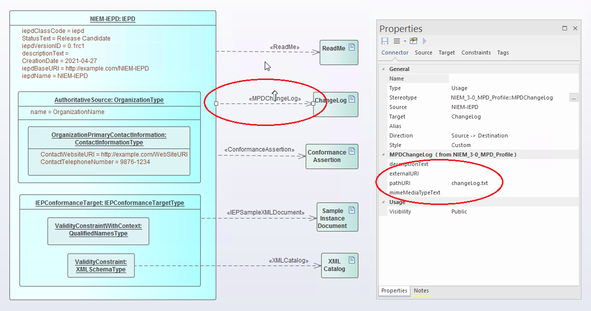 The various filenames are generated into the IEPD's XML catalog files, using values that are specified in the Properties of the relevant Usage connectors.