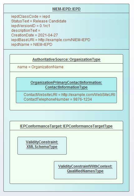 Either of these techniques can then be used to set properties within the IEPConformanceTargetType Object. For example, to set the value of the ValidityConstraintWithContext attribute, create an Object instance of the Class ValidityConstraintWithContextType (which might be an instance of the derived type QualifiedNamesType) and either name it and nest it, or associate it and name the role.