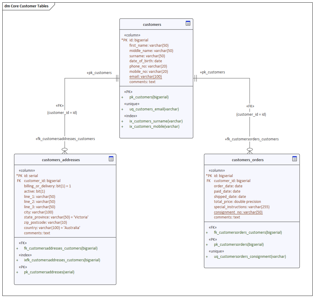 Using the Database engineering features of Enterprise Architect you can create rich models of the objects that make up a data model at any level of abstraction from Conceptual through Logical to Physical. These models are created by adding tables and other database objects from the toolbox or by reverse engineering and existing database into a model from a range of RDBMSs. A database diagram can contain Tables, VIews, Procedures, Sequences and Functions. Table Columns are annotated as Primary and  Foreign Keys are modeled using specialized association relationships. In this example the user has created a simple physical data model of Customers and their Addresses and Orders.