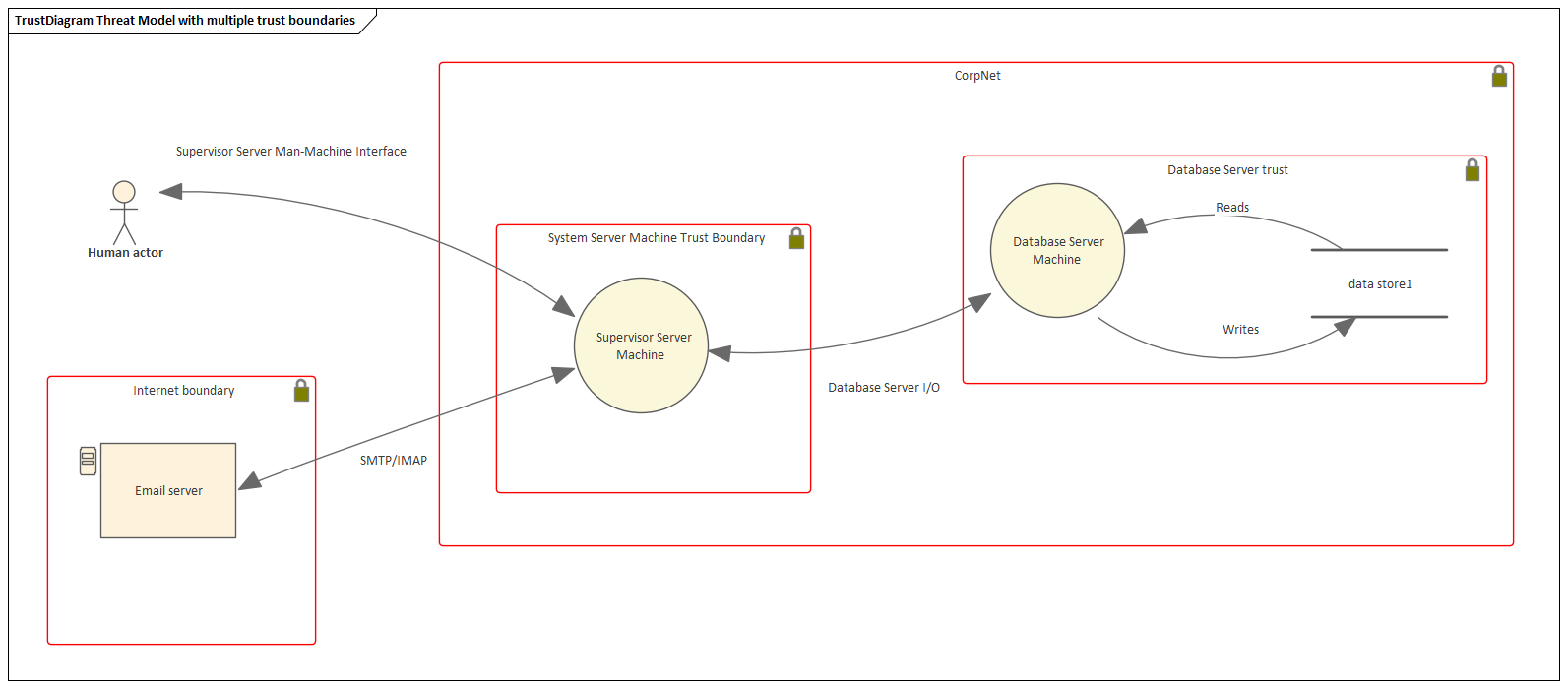 Derived from this pattern, the first figure shows several trust boundaries differentiating between specific security constraints.