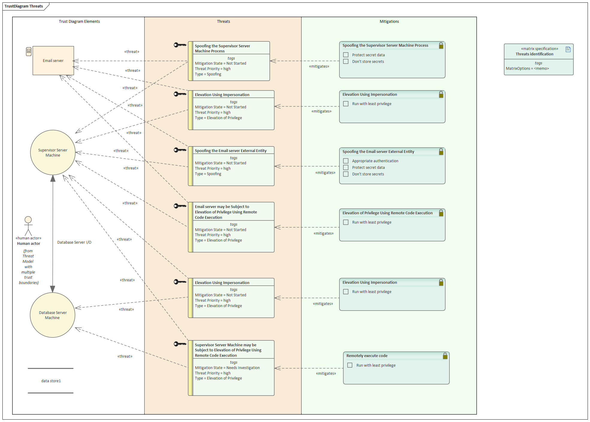 The next figure shows a list of identified threats with appropriate Tagged Values used for threat evaluation.