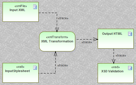 This is the simplest and most common method for modeling transformations. When you drag a file on to the XML Transform diagram, the appropriate Artifact element is generated for you. You can then use the Quick Linker to link the file Artifact elements as inputs to the XML Transform element, using Trace connectors.