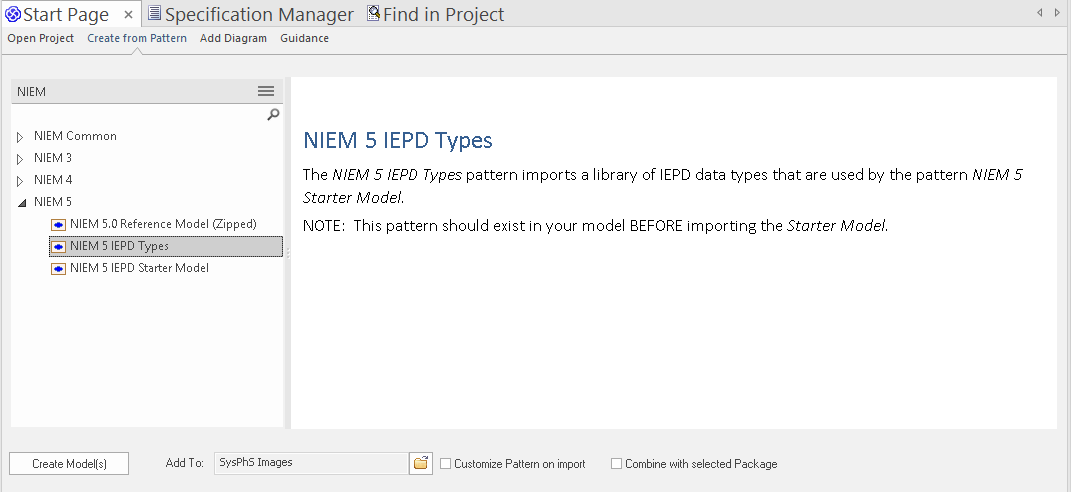 Using the Enterprise Architect Model Wizard (Start Page 'Create from Pattern' tab) you can deploy any of the frameworks supported by the Schema Composer - such as NIEM, CIM and CCTS - to your model in minutes, providing a multi-featured UML medium for modeling in those technologies.