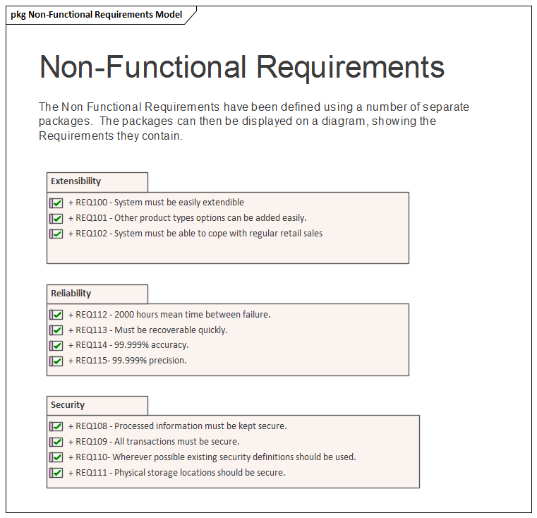 Quality Attributes are often grouped into sets, such as those pertaining to security or performance, or one of the '-ilities' such as Reliability. A requirements Package can be used to group these elements together which provides a convenient categorization for reporting. The Packages can be seen in the Browser window and can also be added to a diagram with the option to display the individual Requirements inside the Package.