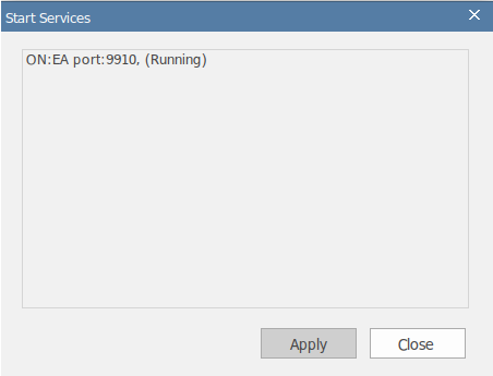 (Above all categories of Service.) This option displays a view that lists the status of each Enterprise Architect service named in the current Configuration file, and its state.