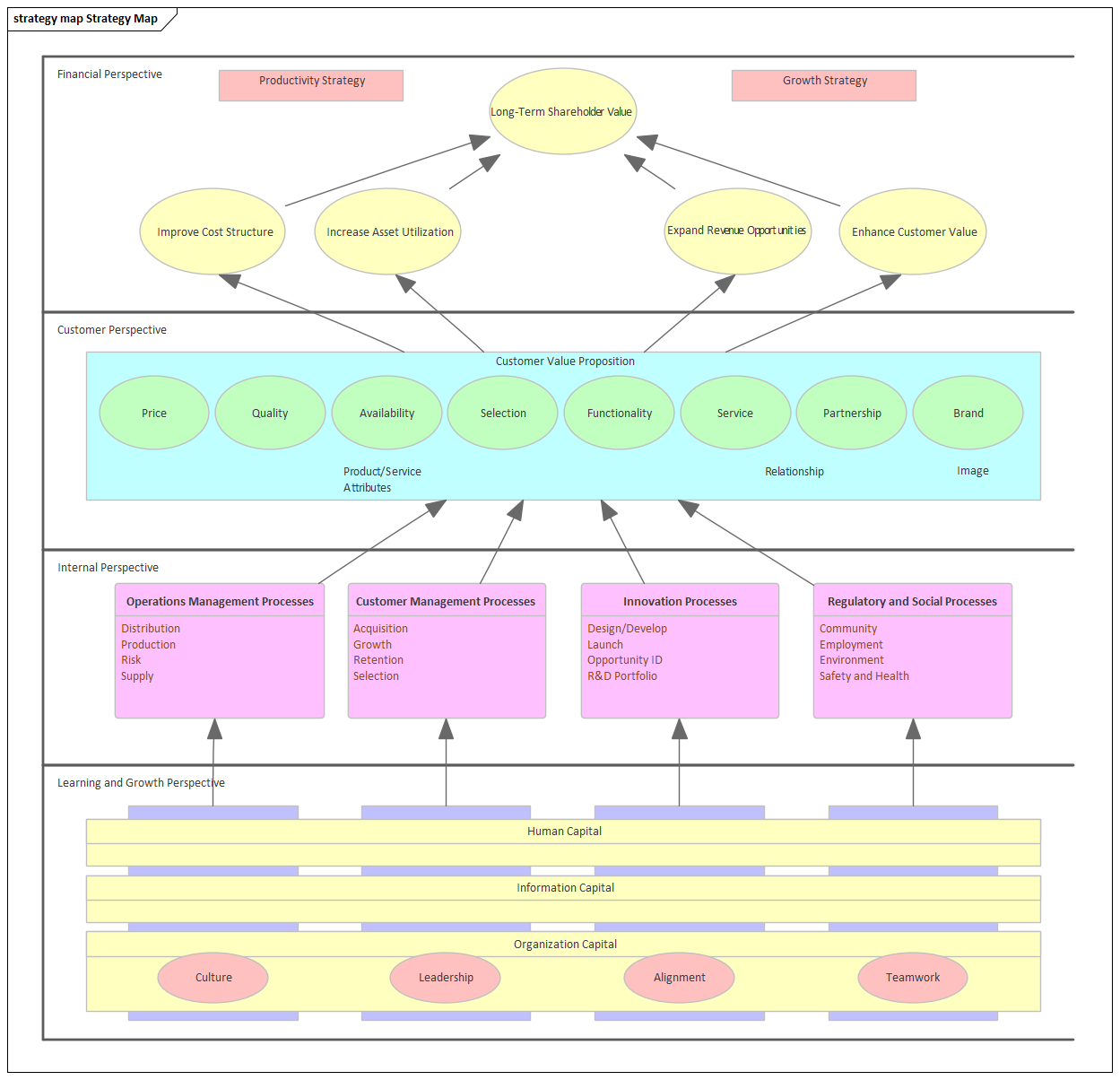 Enterprise Architect contains a number of diagram types that are specifically aligned with creating high quality strategic business models. Strategic models are typically defined by executives, modelers and managers responsible for defining strategic direction and both short and long term goals.