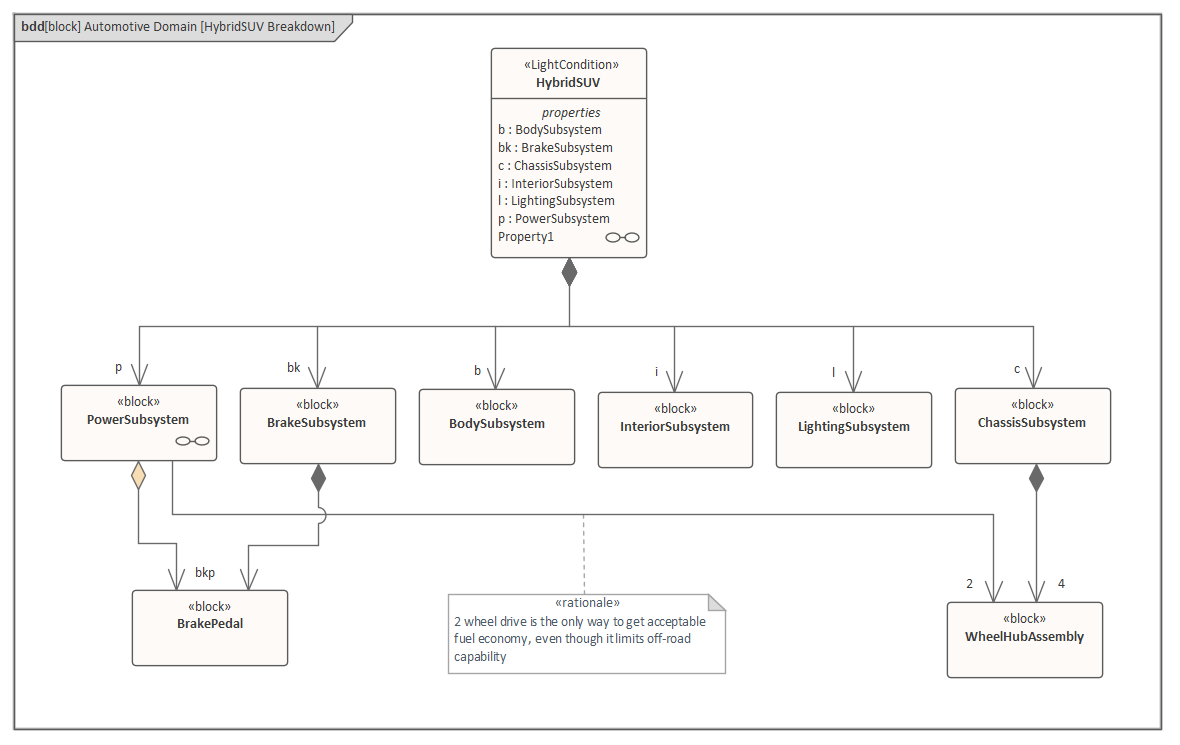 The SysML has similar grammatical categories found in natural languages, with elements that describe structure and other elements that describe behavior. The SysML describes structural things (nouns) using a Block. When engineers create diagrams, they will often use a mixture of behavior or structure elements, describing a particular aspect of a system - bringing to light some aspect of the modeled system.