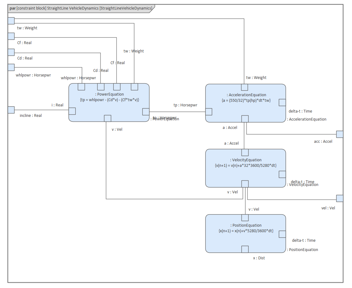 Constraints can be modeled on a block definition diagram and then Parametric diagrams are used to show how theses ConstraintBlocks are used in a particular context, being represented on the diagram as ConstraintProperties. We can visualize how the total power parameter is calculated, connecting the Power Equation and the equivalent parameter on the Acceleration Equation. Connections can be seen between the Position Equation and the Velocity Equation, ultimately connected back to the Acceleration Equation.