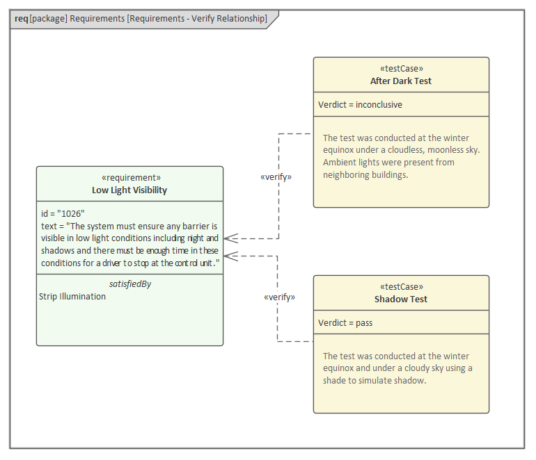 An engineer can use a  requirements diagram to express the relationship between Requirements and test cases effectively verifying that the requirements a met by the system.