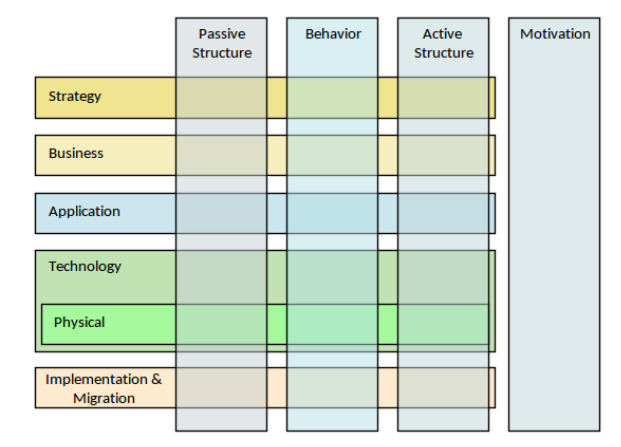 The ArchiMate core framework has been extended to allow architects to model a range of additional  concepts including a cross-cutting motivation aspect that spans all layers and two new layers to model strategy and Implementation and Migration. Another layer is included which is contained in the technology layer that the architect uses to model physical items such as machines and devices.