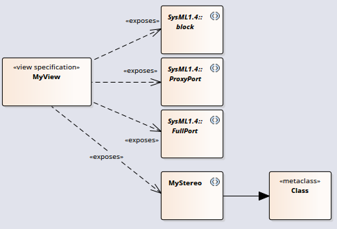 The users select the example diagram View to create a very simple SysML 1.4 Block diagram that can have: