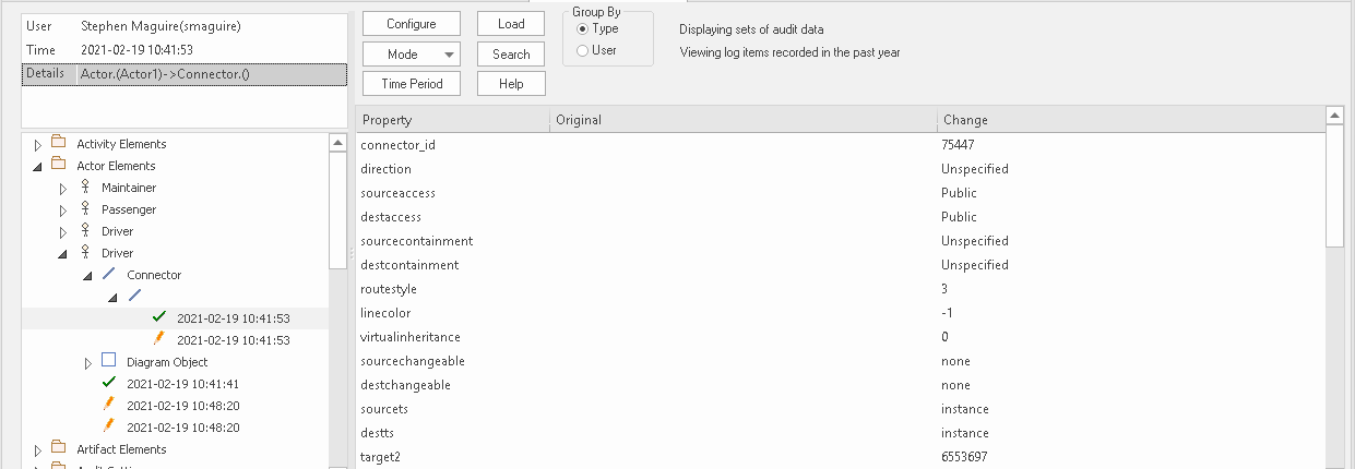 Auditing records model changes, including when the change occurred and who made it. It records changes to Packages, elements, features, connectors and diagrams, detailing the creation, modification and deletion of these items. A Repository Administrator or Librarian typically enables auditing during selected project phases, or continuously during the lifetime of the repository. An Enterprise Architect repository contains important organization information and ensuring that changes to the models are consistent with an organization's intention and governance principles is critical to the success of this important information asset.
