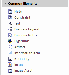The 'Common' pages of the Diagram Toolbox provide the elements and relationships that can be used on any diagram. They are displayed at the bottom of every other set of pages in the Toolbox.