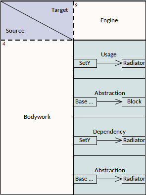 Each row and each column of the Relation Matrix view represents a diagram element. There is small italic number on the top-left corner of each row and column cell, which is the row/column index. The cell at the intersection of a row and a column shows the details of any relationships between the corresponding diagram elements.