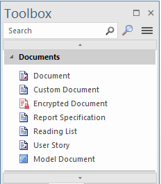The 'Documents' page of the Diagram Toolbox provides a variety of model elements to use for documenting various aspects of the system you are modeling. The different types of document artifact are detailed in the Types of Document Artifact table.