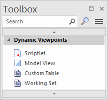 The Dynamic Viewpoints page of the Diagram Toolbox provides a number of elements that actively refresh the interface to Enterprise Architect and the information it displays within various contexts. For example, Working Sets apply a required combination of dialogs and screens, whilst Scriptlets execute JavaScript code to update element displays and properties according to the latest changes to the model data.
