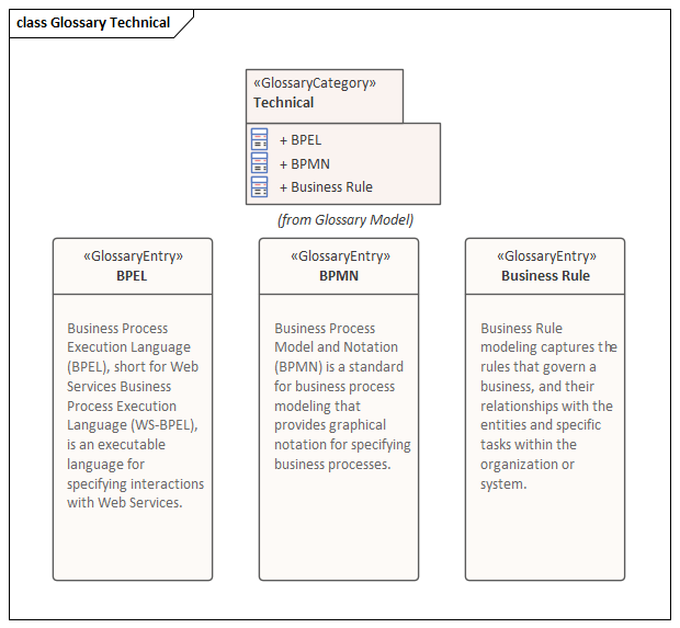 You can define your Project Glossary using a model structure in which the Glossary itself is represented by a Package, and each type of term (such as Business terms or Technical terms) is represented by a child Glossary Category Package containing Glossary Entry elements that define the terms. The structure resembles this illustration: