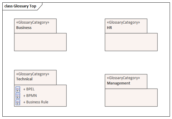 - For each Glossary Category you want to group terms and definitions under, drag the Glossary Category icon from the Toolbox onto the diagram and provide a name for it, such as 'Technical', 'HR' or 'Management'. A <<GlossaryCategory>> Package is created on the diagram and in the model.